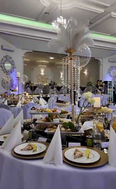Wnętrze Restauracji Moja Pasja łączy elegancję stylu glamour z naturalną lekkością boho, tworząc wyjątkową przestrzeń na stylowe przyjęcia. Wykorzystujemy efektowne tkaniny, świece oraz dekoracje z naturalnych materiałów, które doskonale komponują się z jasną, stonowaną kolorystyką sali. Do dyspozycji gości oddajemy przepiękny ogród z altankami, leżakami i strefą chill, idealną na relaks i rozmowy w plenerze. Dla dzieci przygotowaliśmy bezpieczny plac zabaw, co czyni naszą przestrzeń przyjazną dla całych rodzin. Moja Pasja to miejsce, które zachwyca nie tylko estetyką, ale też wyjątkową, swobodną atmosferą.